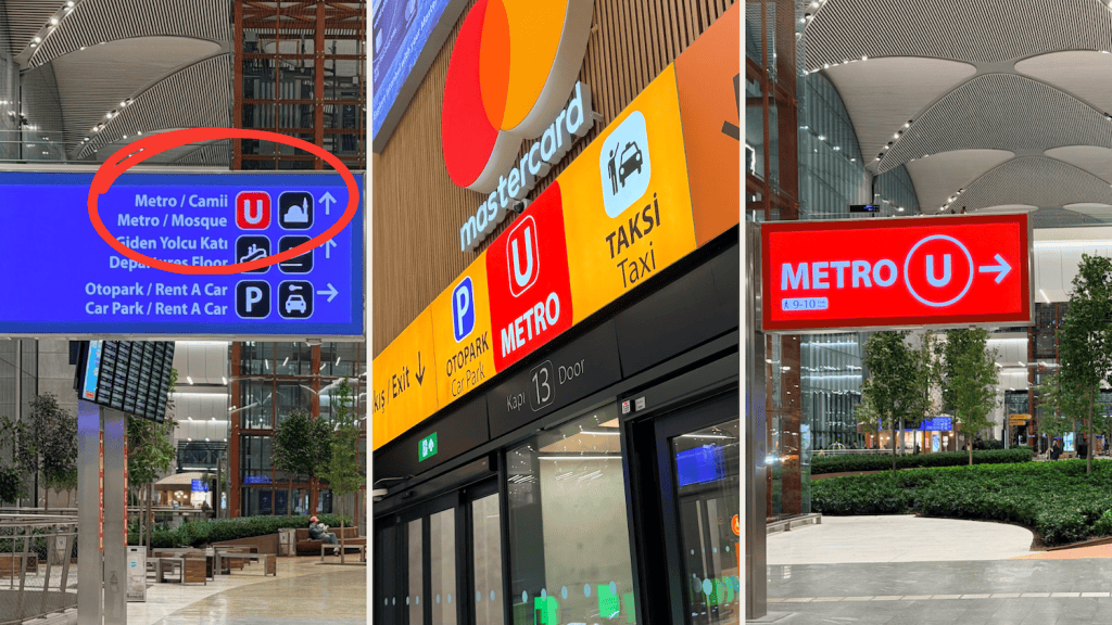 Look for the big signboards with a white letter “U” on a red background that says “Metro“. Follow those arrows until you get to door 13 (kapı 13). Go through the door and keep following the posted signs towards the metro. (Don’t worry, it’s impossible get lost — there are signs literally everywhere!)